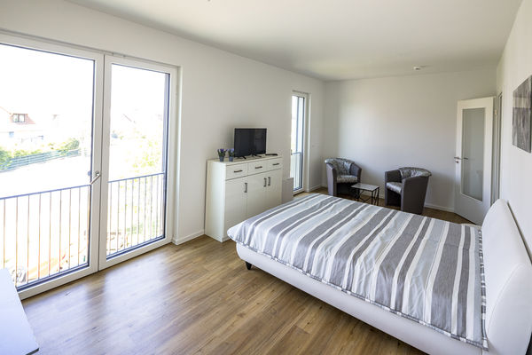 Helle, komplett ausgestattete und barrierefreie 1-Zimmer-Wohnung mit offener Wohnküche, Bad mit bodengleicher Dusche, Schlafbereich mit Ehebett.