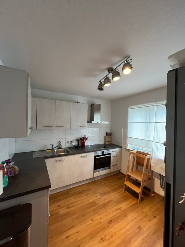 In den Wohnräumen, der Küche und dem Flur wurde eine hochwertige PVC-Designplanke in Eichenoptik verlegt. Die Küche verfügt ebenfalls über einen weißen Fliesenspiegel mit Fliesen im Format 30x60cm. Die Einbauküche kann nach Absprache mit dem Vormieter übernommen werden, jedoch ohne Kühlschrank und Spülmaschine.