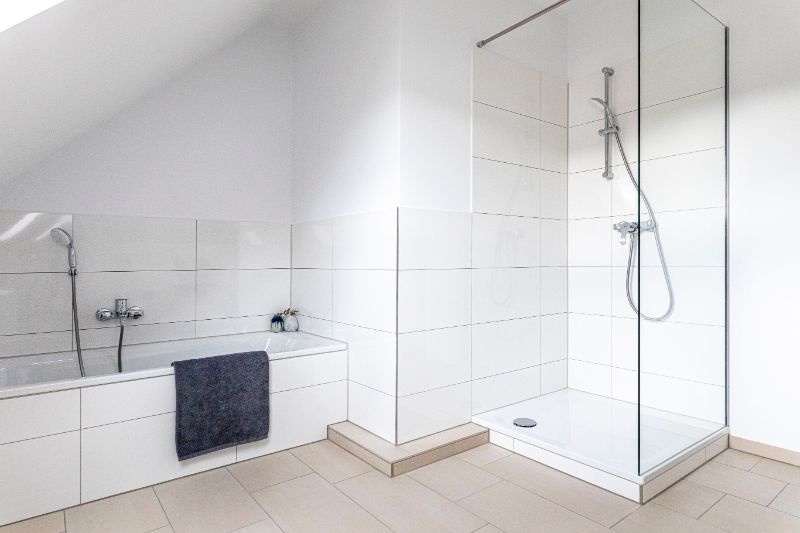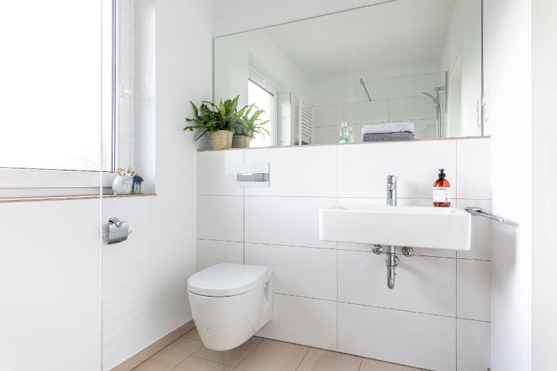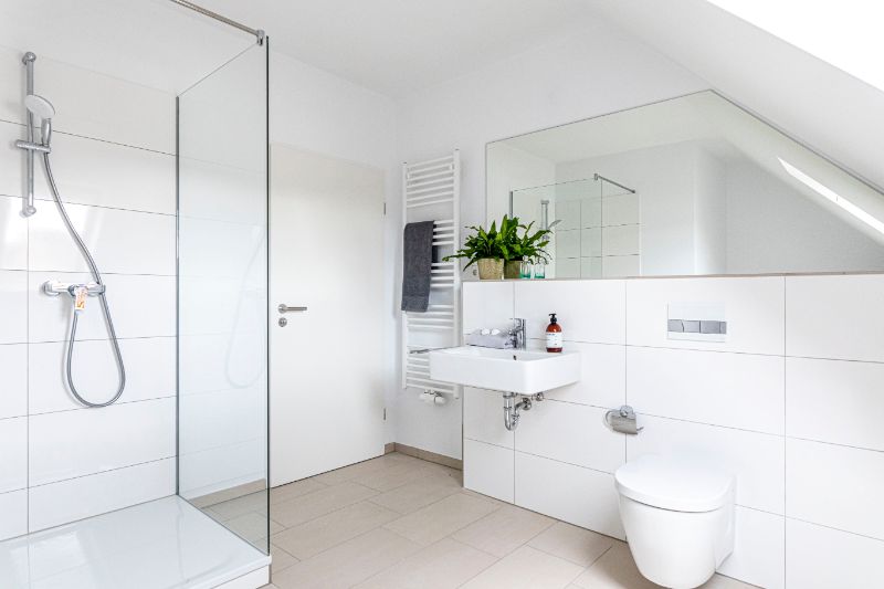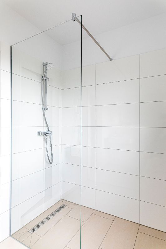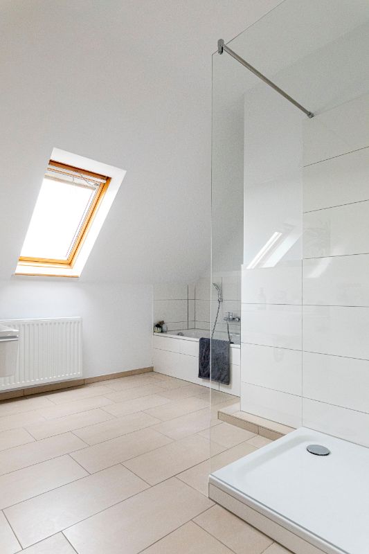 Das Badezimmer im Erdgeschoss ist mit einer Dusche und hochwertigen Fliesen ausgestattet. Ein weiteres Gäste-WC ist ebenfalls modernisiert. Ein drittes Badezimmer im Obergeschoss bietet eine Badewanne und Dusche, ideal für entspannende Momente.
